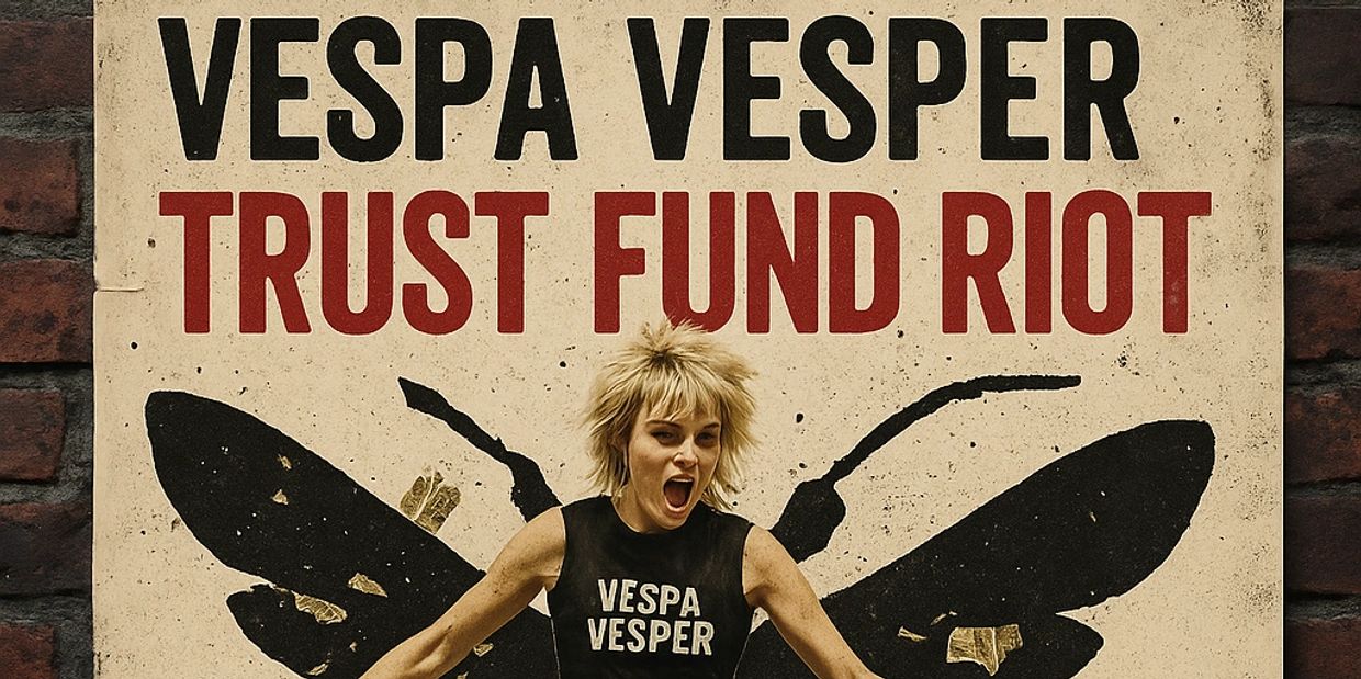 Vespa Vesper’s debut Trust Fund Riot tears through twelve genre-bending tracks—from the viral protest anthem “Panama Papers” to the after-midnight sway of “Evening Hive.” Her shows are part underground club, part revival meeting: Doc Martens stomping over trip-hop grooves while her classically trained voice soars above a wall of guitars and breakbeats.